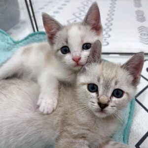 Meet Milton and Mia! Their stunning coloring and pale eyes may stop you in your tracks, but it’s their personalities that really make these blue-eyed beauties stand out. Both Mia and Milton are very playful and incredibly affectionate. They balance each other perfectly and bring out the best in the other. By day, Mia is a natural born leader with the heart of an intrepid explorer. There is no closed door she is not curious about and not a creature she’s met (human, cat, dog) that she does not consider a friend. By night, Mia is a pampered princess who likes all things pink and wants nothing more than a lap, your attention, and some sweet talk. Milton is a loyal follower with a literal heart of gold. He is soft spoken, gentle, slightly reserved, and irresistibly good natured. Whereas Mia leaps without looking, Milton prides himself on having a wise head on his shoulders and always tests the waters first when encountering new people and places. But he takes his cues from his spirited sister and it doesn’t take him long to be 100% in. He has the biggest purr motor, a laugh out loud silly side, and a penchant for making a toy out of anything. Mia and Milton just about complete each other. All they are missing… is you!