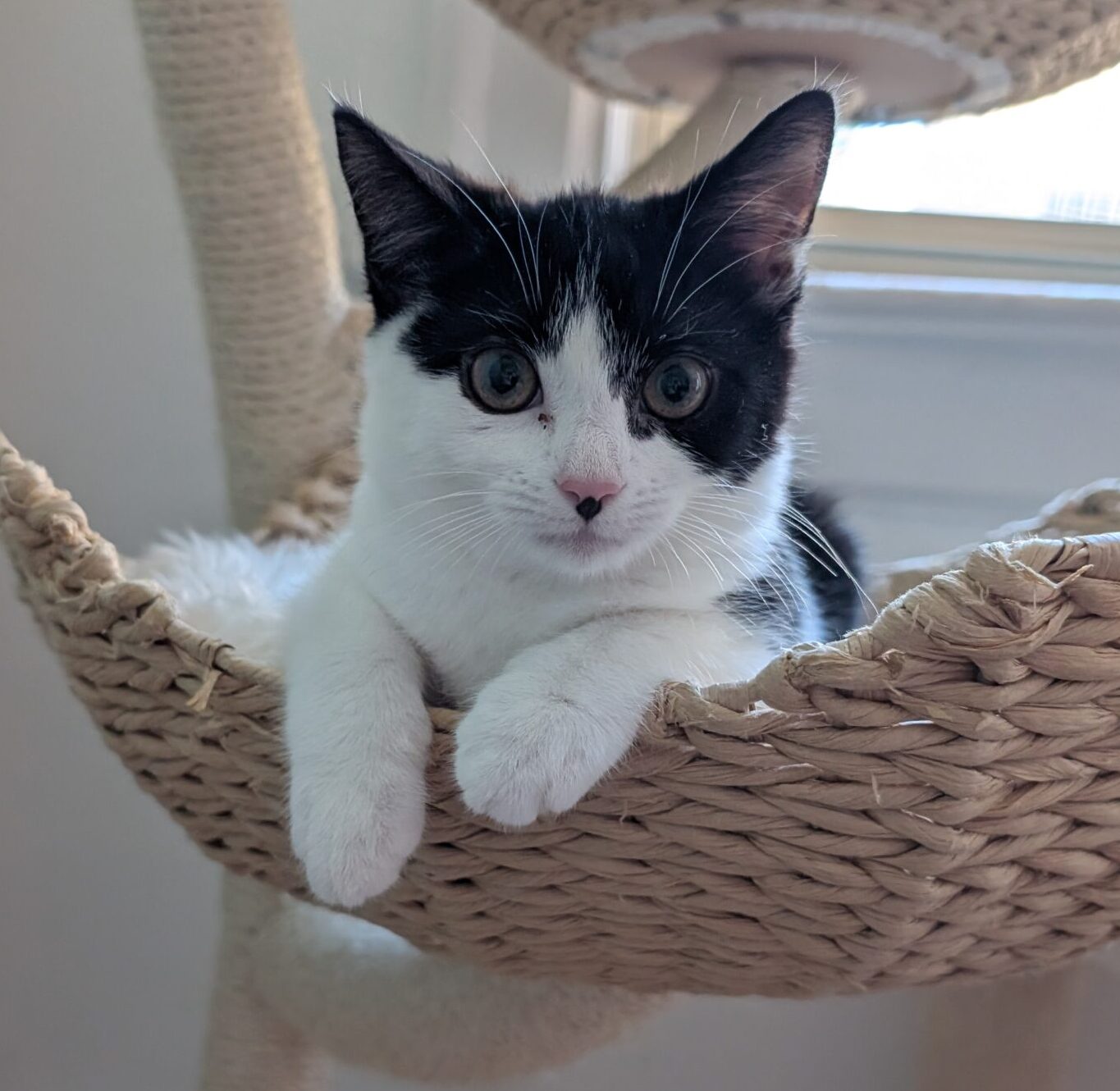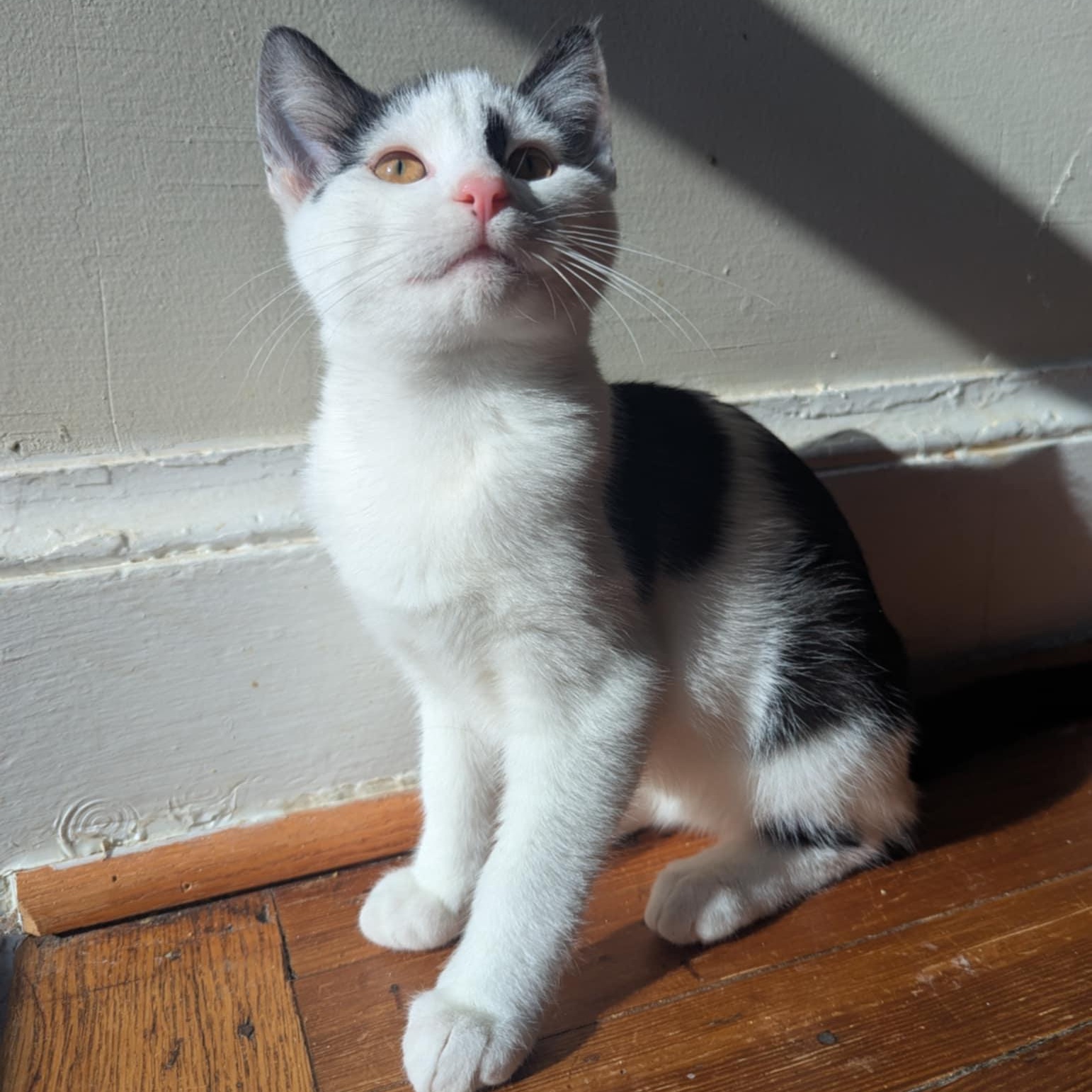 Does your cat need a hypewoman? Adopt Penguin! This sweet black-and-white girl is the ultimate little wing-mate, always ready to waddle over and cheer on her feline friends. She adores other cats and happily follows their lead, offering gentle chirps, curious peeks, and enthusiastic “Can I join?” energy that turns everyday moments into adorable buddy-comedy scenes. Penguin is well socialized and has a soft, affectionate nature, but she can be jumpy in loud environments or when approached too quickly. She’s the kind of kitten who thrives when given a calm space, a predictable routine, and a patient adopter who understands that some cats simply need a little extra time to warm up. Once she feels safe, her purrs rumble like a tiny emperor penguin settling in for a cuddle, and her silky fur and sweet expressions make every bit of patience worthwhile. This girl truly blossoms around other cats, and she would love a confident feline companion who can show her the ropes and help her feel secure. Penguin must be adopted with another kitten (her buddies Schuster or Simon Says would be a great pairing) or into a home with a friendly, playful resident cat. If your cat has been wishing for a loyal sidekick, a cozy cuddle buddy, or a pint-sized penguin to keep them company, Penguin just might be the perfect match.