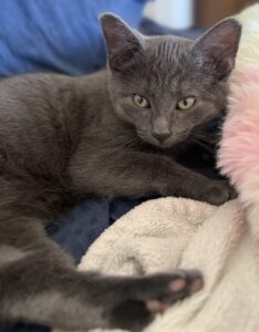 The Turner Classic kittens are just as beautiful and captivating as the Hollywood Golden Age stars they’re named after, and Peter Loree is no exception. This stunning gray boy has a gorgeous coat and striking eyes that seem to glow when he’s on the move. Peter is playful, social, and full of charm. He adores his sisters and will squeak for them whenever he thinks they should be joining in on the fun. He also squeaks at his foster mom to tell her what is on his mind and happily chats back when she responds. Peter is a master of wand toys and will leap into the air with impressive flips that show off his athletic side. When playtime winds down, he is content to curl up nearby and enjoy the company of his people. Peter needs to be adopted with another kitten or go to a home with other young, playful cats.