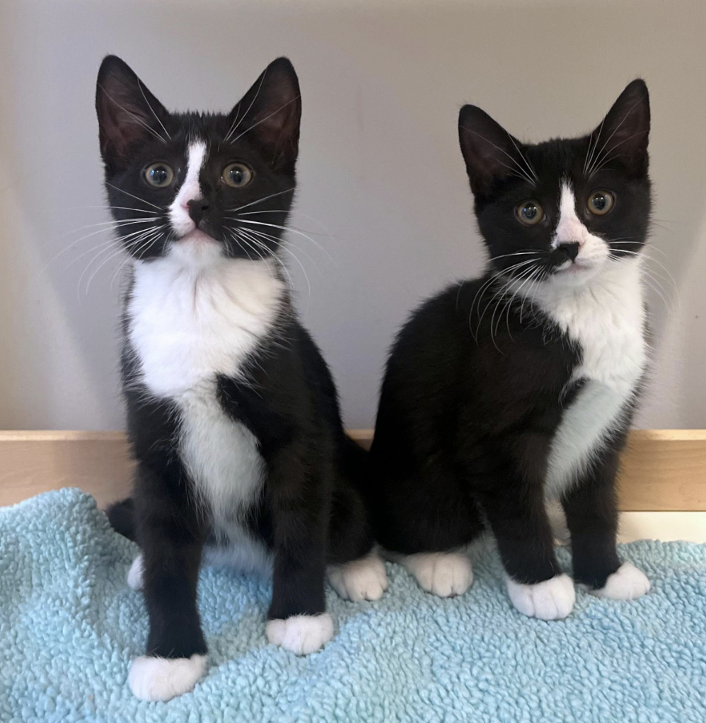 Meet Nori and Nim! These sisters are tuxie “mirror” twins – they are nearly identical from the front, except for the cute little nose dots on opposite sides of their faces. Nim is opinionated, bubbly, incredibly intelligent, and absolutely lives to explore every nook and cranny of her world. But when she is done investigating and inspecting and inquiring, she always comes back to relish in some face rubs and regale you with tales of her adventures. Nori is outgoing, charming, and extremely loving. She is almost always purring. If you’re looking for the sweetest little companion to join you in your daily tasks around the house, Nori is the girl for you! She will follow you around, right on your heels, ready for fun or for whenever a snuggle break is needed! Nim and Nori have been BFFs from birth and are looking for a home together. They are the perfect match to each other – inside and out!