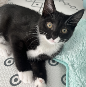 Katydid isn’t just any kitten—she’s a one-of-a-kind sweetheart who hops through life with pure joy and unstoppable charm. Born with spina bifida (also known as Manx syndrome), Katydid has no tail and walks in what’s called a “plantigrade stance,” meaning she moves with her back legs stretched out behind her in a gentle bunny-hop style. That adorable gait is exactly how she earned her name—like her namesake insect cousin, she’s always bouncing around with spirit and curiosity! Katydid’s condition also affects her bladder and bowels, so she needs a little extra help from her humans. Her foster mom expresses her bladder and bowels three times a day (it’s easy to learn—takes about five minutes total), and Katydid wears adorable washable diapers the rest of the time. Think of it as her own personal fashion statement! Plus, you won’t need to add a litter box for her since she can’t use it! Once you meet her, though, it’s Katydid’s personality that will steal your heart. She’s endlessly affectionate, always purring, and happiest when snuggled up with her people or kitty friends. She loves to be kissed, held, and doted on, and she returns every ounce of affection tenfold. Between cuddle sessions, she’s a whirlwind of play—chasing wand toys, hopping after fuzzy balls, and zooming up and down the stairs like it’s her personal racetrack. The only thing she can’t do? Jump onto your kitchen counters. (We call that a bonus feature.) Katydid is very social and thrives on feline friendship, so she needs to be adopted to a home with another young, playful cat or kitten who loves to wrestle, chase, and nap in a cozy pile. She hasn’t met any dogs yet, but we suspect she’d do great with gentle, cat-savvy pups. She’d also be a wonderful companion for kids or adults alike. To make her transition easy and stress-free, Tails High is offering an extended 30-day foster-to-adopt period so her new family can learn the ropes with support from Katydid’s foster mom and our veterinary team. Her foster mom will teach you everything about expressing and diapering, and Katydid will come with her very own diaper wardrobe—because a girl’s gotta have options! Katydid can’t wait to bounce her way into your life!