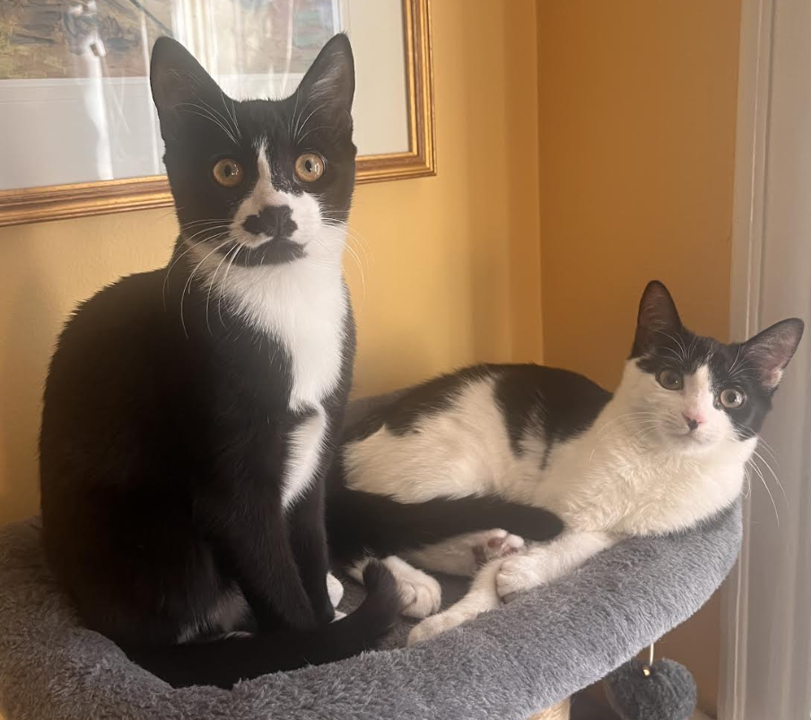 Miranda and Penguin are a bonded tuxedo duo whose relationship is built on trust, loyalty, and a whole lot of love. These two are inseparable and must be adopted together—they look out for one another constantly and clearly feel safest and happiest as a team. Their days are a joyful mix of affection and chaos: sudden sneak attacks that turn into rolling wrestling matches, followed by mutual baths, snuggling, and then—inevitably—another burst of zooming and playful mayhem. It’s all part of their shared language and deep bond. Miranda is the outgoing half of the pair—a playful, affectionate girl who truly loves her humans. She adores interactive play and seeks out attention with enthusiasm. When Miranda comes in for affection, her engine is already running: she purrs loudly through full-body rubs and happily presses herself as close as possible. She loves being near her people, often following them from room to room, and may even choose your head as a perfectly acceptable place to sit. Miranda brings confidence, warmth, and joyful energy into every space she enters. Penguin is much quieter and more sensitive. She is still a shy girl and can be easily startled, especially in new situations or busy environments. Penguin takes her time observing before engaging, and she relies heavily on Miranda for reassurance and confidence. While she does enjoy play—romping after toys, boxes, or bottle caps—she approaches affection gently and on her own terms. Penguin shows connection through proximity, calm presence, and loyalty rather than bold cuddles. With patience and consistency, she continues to make small, meaningful strides, but she will need a home that understands and respects her need for time and safety. Together, Miranda and Penguin are beautifully balanced. Miranda helps Penguin feel brave; Penguin grounds Miranda. Their bond is genuine and deep, and watching them care for one another—whether through playful tumble-fights or quiet moments curled together—is incredibly special. They will thrive in a calm, loving home that values companionship, understands that personalities unfold at different speeds, and appreciates the magic of a bonded pair. If you’re ready to welcome two hearts that truly belong together, Miranda and Penguin are waiting to grow with you—side by side.