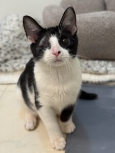 Cosmo may be a little shy, but behind that cautious gaze is a tenderhearted sweetheart just waiting for his person. With his perfectly painted mustache and thoughtful eyes, he looks like a tiny gentleman — and he lives up to the part. He’s still building his confidence, so he prefers to observe from a cozy hiding spot at first. But once he realizes he’s safe, he melts into a ball of purrs and head nuzzles. Watching him choose to trust you is incredibly special. Cosmo is a big fan of Churus and will happily let you win him over with a tasty treat. He also adores playtime with his sister Nova and lights up when he’s around other cats — he’s especially curious about making new feline friends. Having a confident kitty companion in his forever home would help him continue to blossom. As a former community kitten, the human world is still new and sometimes a little overwhelming. He’s looking for a patient, gentle adopter who will let him settle in at his own pace. In return, he promises to be your loyal, loving best friend for years to come. ***Cosmo must be adopted with his sister Nova OR to a home that already has another young cat or kitten.***