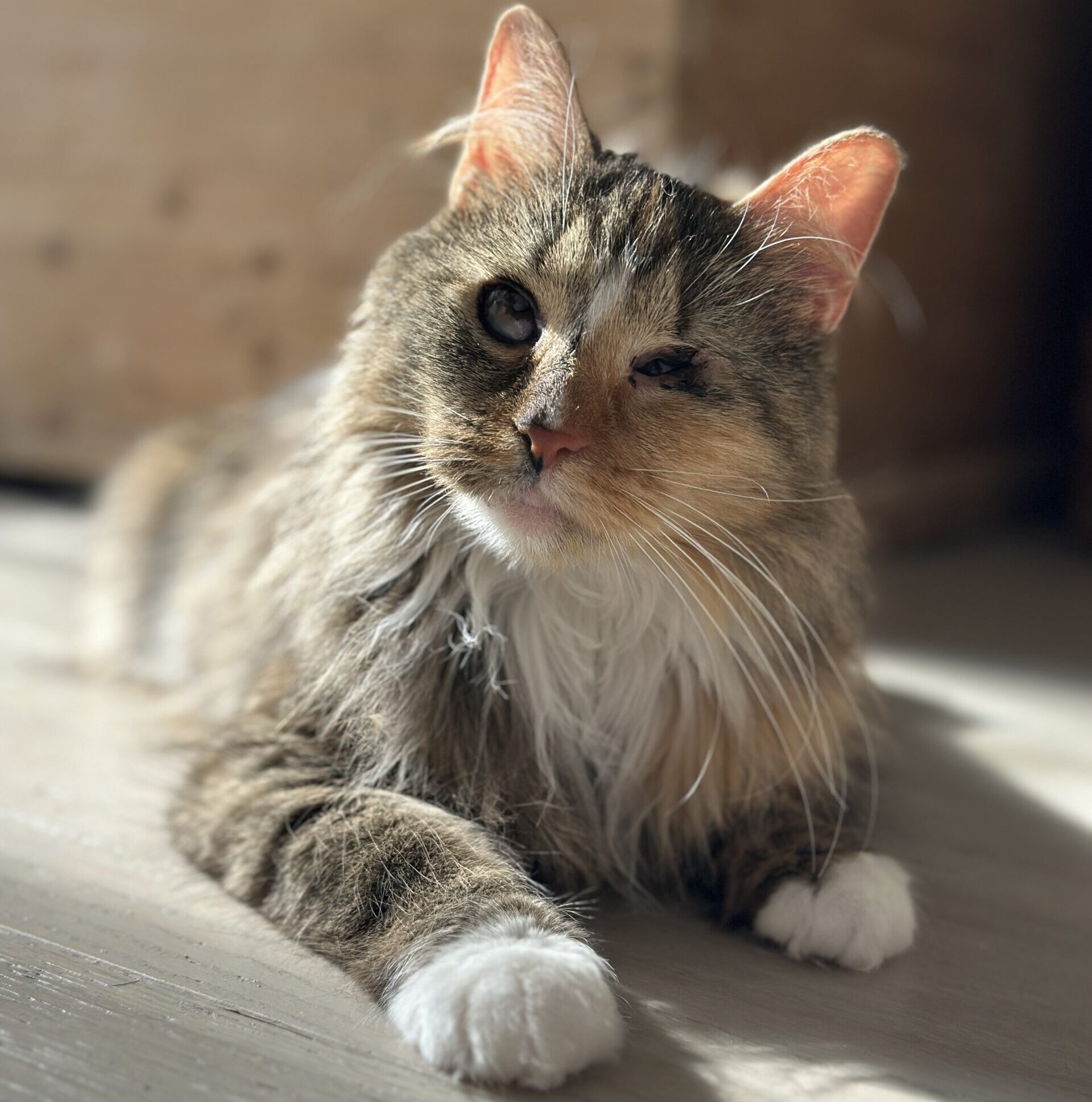 Kaleidoscope, or Kalei as her foster mom and friends call her, is a 3-year-old torbie fluff with a heart as big as the sky and a spirit even brighter. Though she’s blind, Kalei doesn’t see the world as limited. In fact, she sees it more beautifully than most, with curiosity, confidence, and pure joy. Like the shifting patterns of her namesake, she makes every day feel full of color and wonder. Petite in size, with a short tail she whips back and forth in excitement, Kalei is overflowing with personality. She greets new people like old friends, eager for love, headbutts, and maybe even a few purrs. It’s hard to believe this sweet girl once came to us shut down and scared. Now she’s crafted a world that’s all her own, where everything is new, fun, and worth exploring. And explore she does. Kalei runs, plays, climbs, and chases her foster kitten friends with fearless joy. She’s especially drawn to wand toys with bells she can follow by sound, darting after them with delight. You’d never guess she’s blind watching her confidently zip up and down the stairs or leap onto the couch just to curl up next to you. Kalei adores affection. She’ll purr by your side, press her head into your hands for more scritches, and nuzzle you just to say, “You’re my best friend.” Because she grew up without other kittens, she sometimes plays a bit rough with hands and may give you a playful nibble, but it’s all part of her charm. Kalei would thrive in a home with a calm, friendly cat companion, or she’d be just as happy as your one and only, spoiled and cherished like the rare gem she is. Blindness doesn’t define Kaleidoscope. It just adds to her magic. If you’re ready to open your heart to a truly special girl who sees with hers, Kalei is ready to light up your life with every step, purr, and joyful swirl of her colorful world.