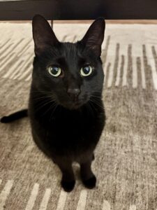 Have you ever wanted your own miniature panther as a pet? If so, you’re in luck: Willow is the perfect sleek companion — with her luxurious black fur and striking green eyes, this gorgeous girl will stop you in your tracks. But she’s not all looks: Willow, who her foster parents affectionately call Shadow because of her eagerness to always be at your side, has the biggest heart and is eagerly awaiting human companions to call her own. Willow can be a bit shy with new people, but with the tiniest bit of love and reassurance from her person, she steps right up as an amazing companion. She has an incredibly gentle, kind, and loving nature … this girl will take all the cuddles you have to offer, and is eager to be a best friend who is always by your side — truly looking to be your little shadow! She is keen to hang out wherever you are, sharing space and giving you all of the nuzzles and kisses and hugs with her tail. She is content in your lap or lying curled up next to you, and accepts all the scratches you have to offer with enthusiastic purrs in return. Shadow adores being brushed, and is lovely to handle. She’s a smart, good-natured, and easily trainable girl, eager to please, and has naturally good manners. She enjoys some playtime, too, chasing balls and toys or playing with a wand when the mood strikes her. Willow does sometimes find sudden movements, loud noises, or strangers a little scary, but looks to her humans for guidance and security — she gets more confident by the minute in a calm, relaxed, loving home and will settle in nicely with people who offer her a secure space and encourage her to come out of her shell. All it takes is a good scratch and a snuggle when she’s feeling timid, and she melts right into you. This loving jungle cat is so ready to find her forever home. She would do well with a single adult or a couple, but would also likely be a lovely friend for an older child who could help her settle in calmly.