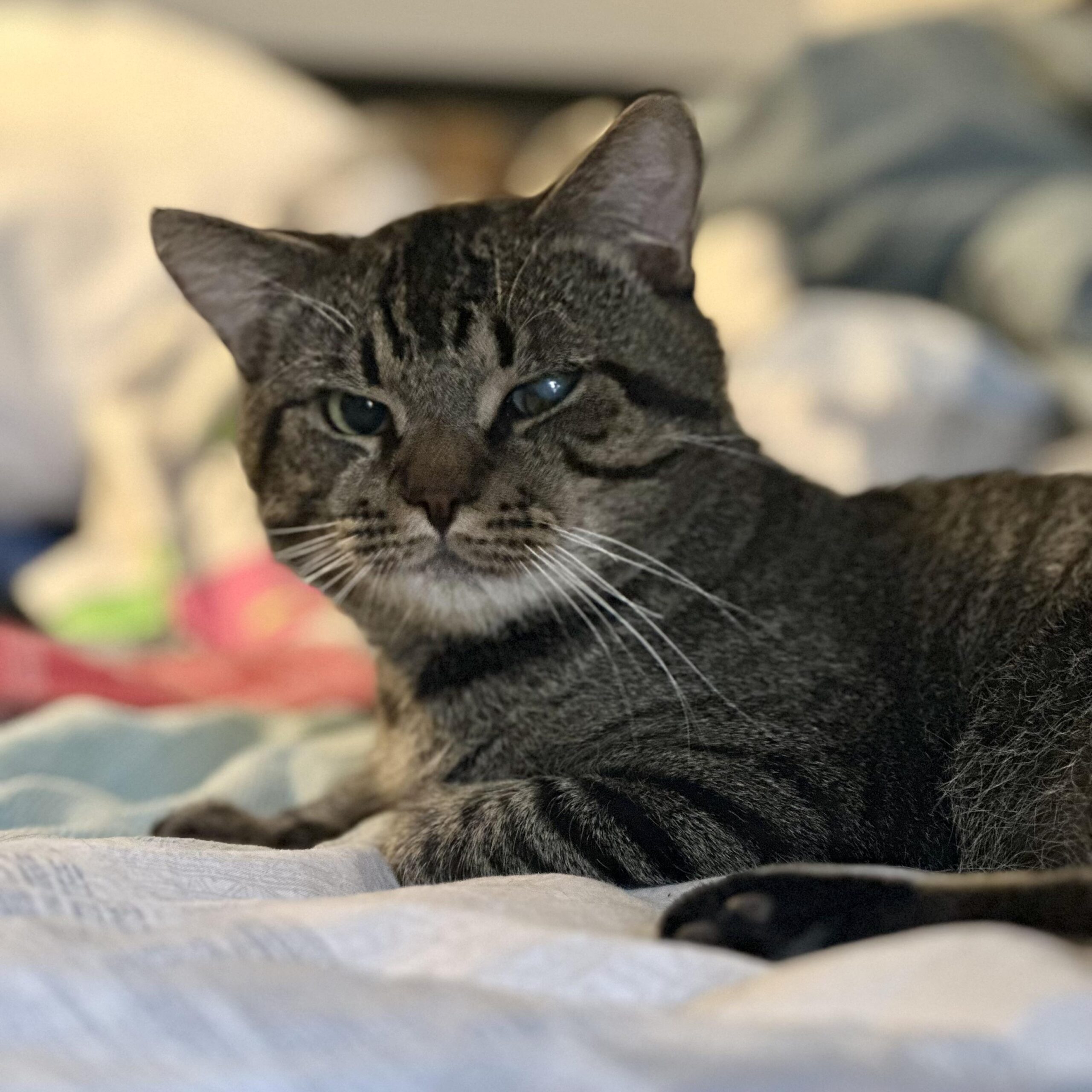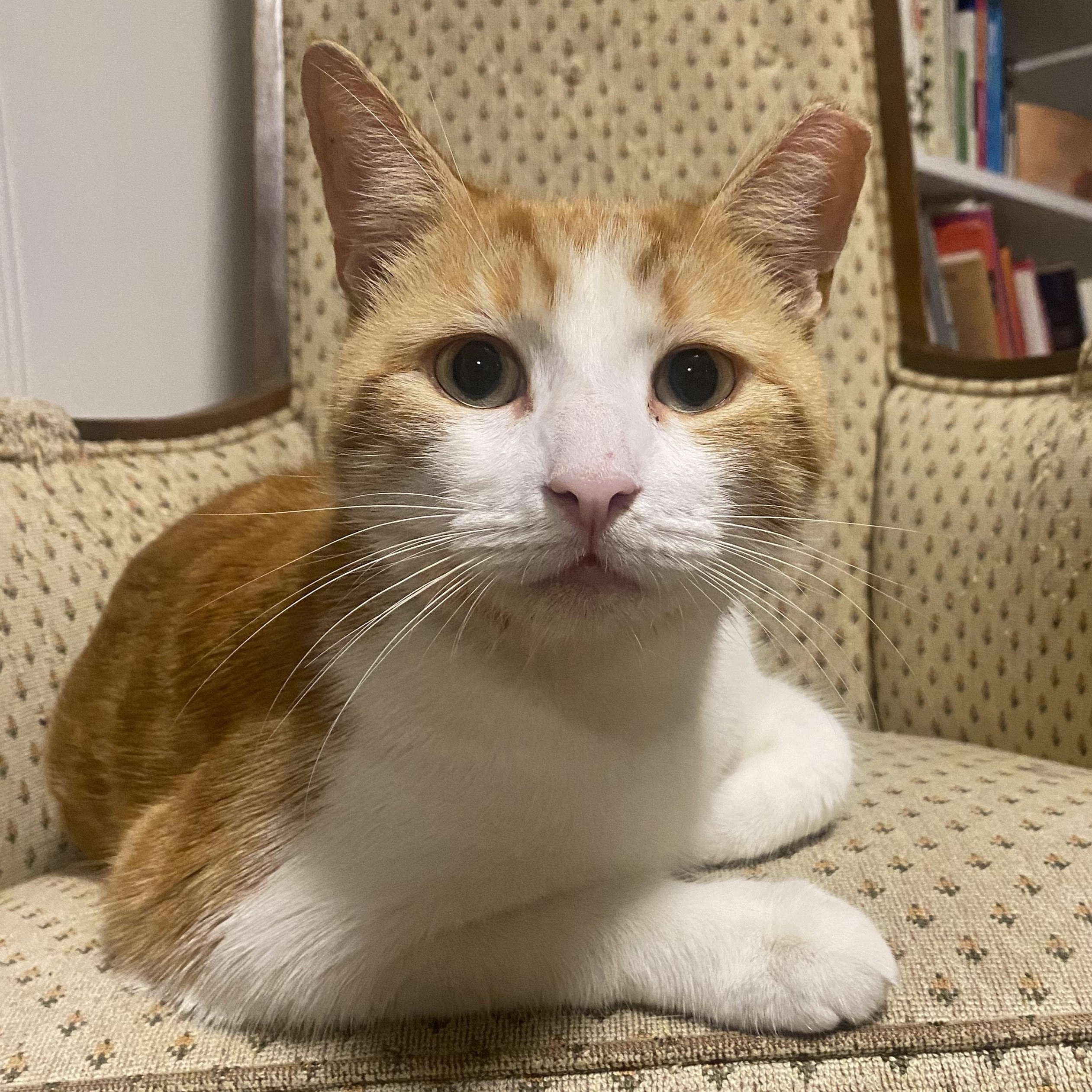 Flapjack (or Jackie, if you prefer) is a 3-year-old sweetheart who arrived on his foster’s doorstep with one mission: prove that breakfast (and second breakfast!) is very important. Ever the gentleman, he patiently waited for the resident outdoor cats to finish eating before helping himself. Once his fosters brought him inside for vet care, Jackie wasted no time announcing that he was, in fact, born to be an indoor cat. Within hours he had discovered the joys of soft blankets, warm laundry, and being doted on like he always deserved. Flapjack has scarring on his left eye from a previous injury, but it doesn’t cause him any discomfort, and he doesn’t let it slow him down one bit. He navigates his world confidently, plays with enthusiasm, and remains one of the gentlest, most patient boys you’ll meet. He’ll sit quietly and wait for his dinner, greet you with cheerful chatter, and melt into purrs the moment you start petting him. Content to curl up in your lap or snooze nearby, Flapjack is the ideal companion for anyone looking for a calm, affectionate cat with a truly grateful heart. If you’re searching for a comforting presence—warm, steady, and as satisfying as the perfect stack of pancakes—Flapjack is ready to come home.