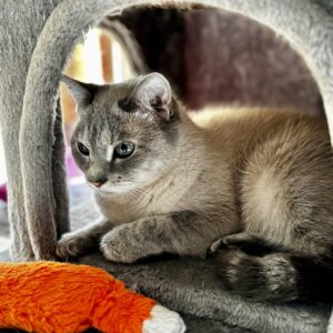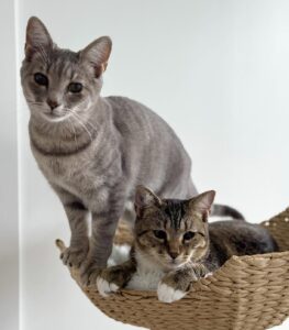 Gazelle and Springbok are a bonded pair of tabby sisters looking to bring their sweet dispositions and comedic relief to a very lucky home. These goofballs are very people-oriented, affectionate, and playful! Gazelle is a lilac/lavender tabby with a slight hint of taupe, and Springbok is a black & brown tabby with luscious whiskers. Gazelle enjoys snuggles and is known for her friendly little paw tap greetings. Sprinbok enjoys chasing all kinds of cat toys while running a successful cardboard demolition business. What makes this dynamic duo truly special is their origin story. Gazelle and Springbok have showed such resilience over the last several months since being rescued as kittens. While the girls will continue to have unique eyes for life, they’ve been checked out by our ophthalmologist that confirmed they have normal vision, only requiring intermittent use of eye drops to keep them feeling their best. Their tenacity, resilience, and bravery are awe-inspiring. Gazelle and Springbok are the perfect combination of sweet and silly! They keep their foster family entertained with their antics, including sunning their bellies and frequent bleps. At just one year old, they’re playful like kittens and very affectionate, always curling up in the cat tree for a snooze or together in a cozy bed. This pair gets along well with the resident kitties in their foster home and would happily join an existing cat family or be perfectly content to be adopted together without other pets. As long as they have each other, they’re happy as can be!