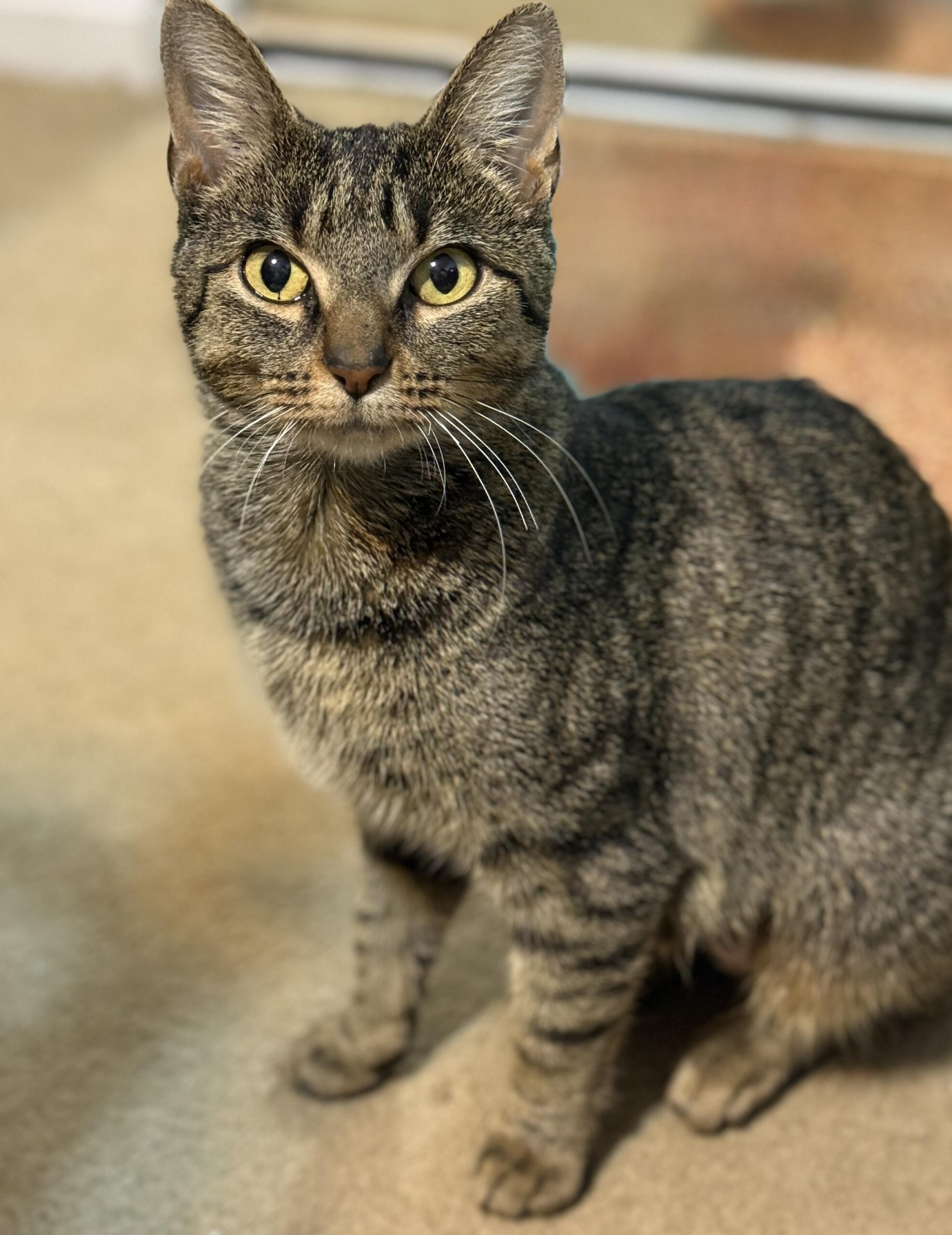 Elizabeth Taylor, known as Lizzie, is a stunning brown tabby with a sweet spirit and a naturally warm, friendly charm. She’s petite, elegant, and instantly lovable, greeting new people with curiosity and affection. Lizzie settles in quickly and loves being part of the action. She has a playful streak, enjoys exploring, and is just as happy to curl up nearby for cozy downtime. She’s comfortable around other friendly cats and even handled meeting a small dog with confidence, so she could easily shine as a solo star or join an established furry cast. If you’re looking for a gentle, social, and spirited young cat who brings a little classic beauty everywhere she goes, Lizzie is ready for her forever home.