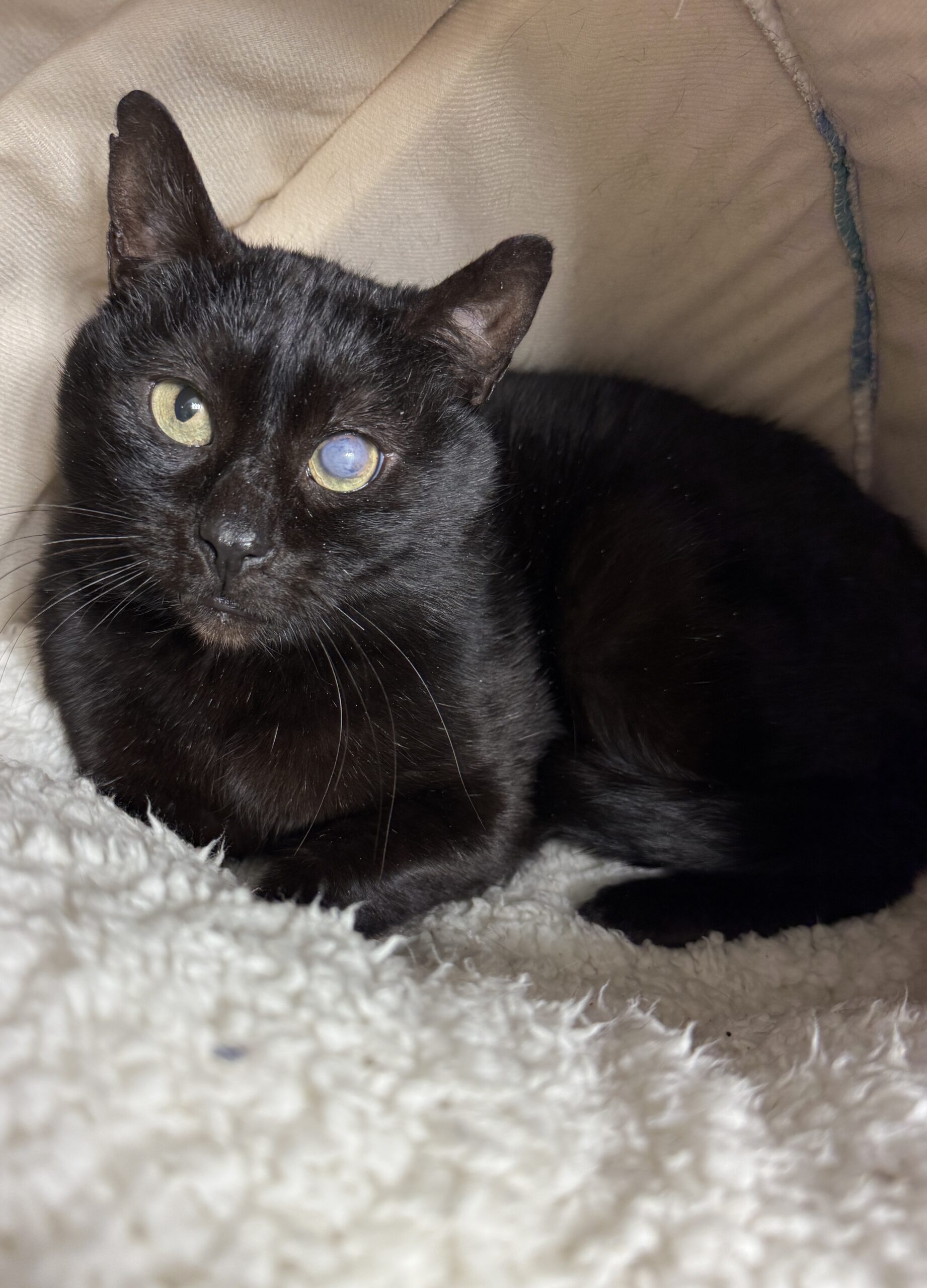 Trusty Trinket is a one year old black kitty with the gentlest heart. After coming from a difficult situation, he has shown nothing but love and sweetness to everyone he meets. Trinket is a soft spoken, shy little guy at first, but once he feels safe he melts into an affectionate companion who is happiest curled up in your lap soaking up reassuring pets. He gets along wonderfully with other cats and especially enjoys spending time with his foster sister Kaleidoscope, who is also available for adoption. The two play together, share cozy spots, and occasionally burst into zoomies around the house. Trinket’s scarred eye from an old injury does not affect his vision at all and certainly does not slow him down when it comes to wand toys or chasing after his feline friends. One of his most charming traits is his tiny, high pitched chirpy voice that he uses when bird watching or announcing that it is time for his favorite event of the day, mealtime. Trusty Trinket is a tenderhearted boy who just needs a loving home to continue building his confidence and sharing his quiet affection.