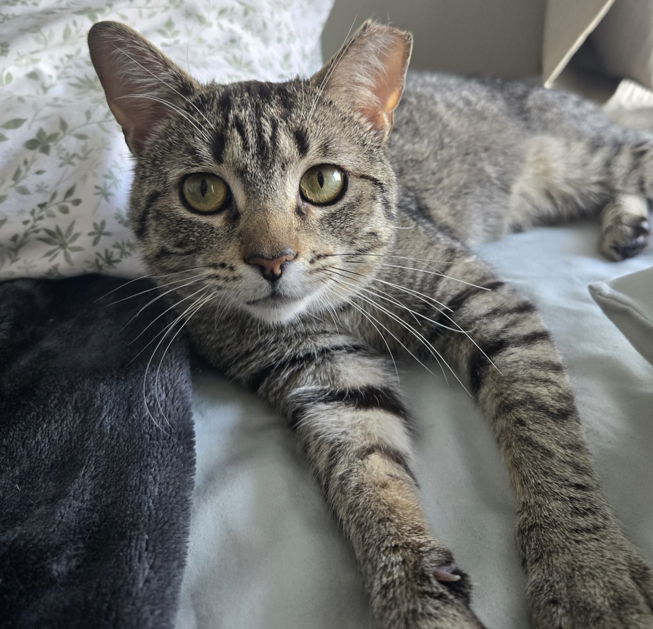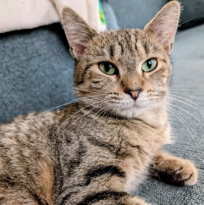 Wilbur is a two-year-old tabby with a big personality, an even bigger heart, and just the right amount of mischievous charm. He’s incredibly playful whether he’s romping with other cats, entertaining himself with his toys, or inviting his humans to join in, and he’s especially proud of his favorite trick of carrying toys around in his mouth and “gifting” them to you. Don’t be surprised if you find a toy mouse tucked into your bed or scattered across the room shortly after you’ve neatly put everything away. When playtime winds down, Wilbur turns into a total cuddle bug who melts in your arms when picked up, happily lets you hold him like a baby, and tolerates all the kisses you want to give. He loves perching behind you on the couch with a paw resting on your shoulder as if to remind you he’s always close by, and he’ll keep you company with his sweet little meow, especially when he knows mealtime is coming. He also enjoys spending time by the window, watching birds and the world go by, chattering softly at all the action outside. Wilbur has been friendly and social with his foster sister Wanda, resident cats, and even the neighborhood visitors beyond the window, and he would do best in a home with another playful cat who can match his energy and help him burn it off. When he occasionally gets a little too enthusiastic, he responds well to feedback and quickly adjusts. Before coming inside, Wilbur lived in a tabby colony near a rec center and soccer field, where he was the boldest of his siblings when it came to seeking out human affection and, unsurprisingly, the most food-motivated, which earned him his adorable piggy-inspired name. He’s a great eater who rarely leaves anything behind, prefers a top-open litter box, and can be a little mouthy during play or cuddle sessions, sometimes giving gentle nibbles or testing out the sturdier parts of his toys. With his playful spirit, affectionate nature, and endearing quirks, Wilbur is the perfect mix of fun and snuggly and is ready to bring a lot of joy and personality to his forever home.