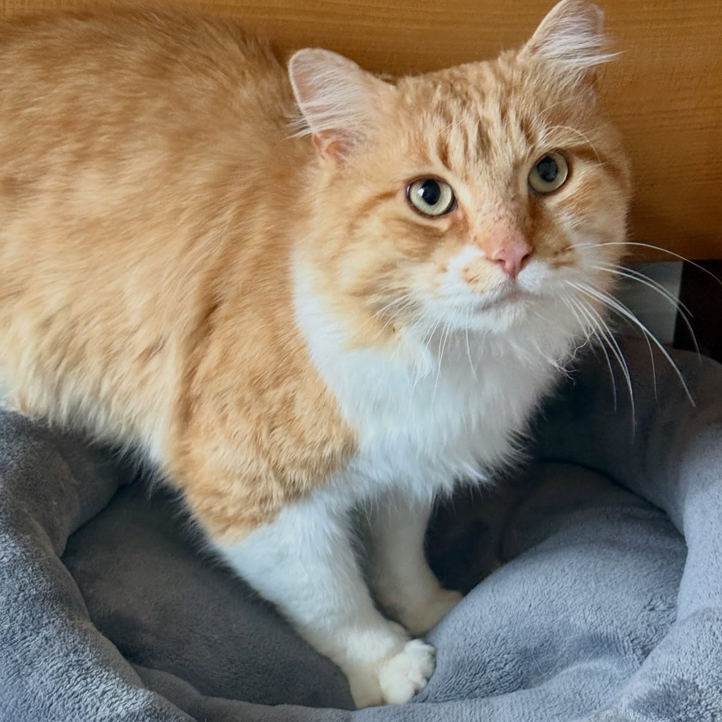 Sir Archibald McChicken is a floofy young king with a big personality and an even bigger heart. At just two years old, Archie is playful, affectionate, and endlessly charming. He loves batting his toys across the floor, watching birds through the window, and curling up beside you in bed for a good cuddle session. If you are looking for a cat who will keep you company and make you smile every day, Archie is your guy. Archie was found at a community cat colony, but it quickly became clear he was never meant for life outdoors. He is far too friendly and social to be fending for himself. Thanks to caring advocates who saw how special he was, Archie made his way into foster care where he has embraced indoor life with enthusiasm. Archie is FeLV positive but currently healthy and thriving. He can live happily with other FeLV positive cats or be adopted as your one and only companion where he can soak up all the attention himself. This handsome boy is ready to start his next chapter with a family who will adore him as much as he deserves.