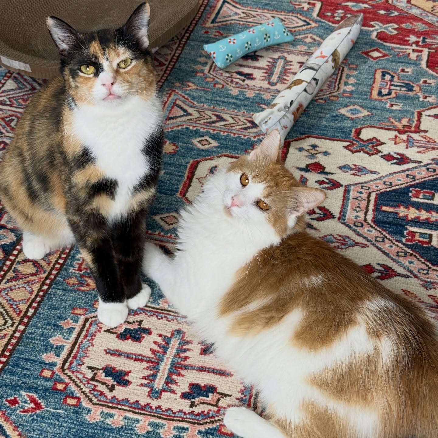 Clair de Lune and Soleil are a bonded pair of 2 year old girls who brighten every room with their gentle, loving energy. These two had a tough start surviving outdoors but their sweet personalities quickly shined through once they were safe. It was clear from the beginning that they were inseparable. Lune is soft and thoughtful like the moonlight she is named for, while Soleil is bold and sunny with a playful spark. They adore each other and are often found walking side by side with tails intertwined. They enjoy wand toys, cozy window perches, and being near their people. They have also blossomed beautifully in foster care thanks to a patient and loving foster family. Both girls are FeLV positive which means they need to remain together and be the only cats in the home or live with other FeLV positive companions. They are healthy, happy, and ready for a calm home where they can continue to thrive. If you are looking for a pair of affectionate companions who will fill your home with warmth and charm, Clair de Lune and Soleil are ready to light up your life.